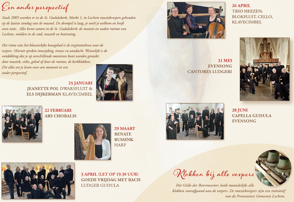 Het Gilde der Beiermeesters luidt maandelijks alle klokken voorafgaand aan de vespers. De muziekvespers zijn een initiatief van de Protestantse Gemeente Lochem. Vrije gift.